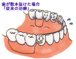 奥歯が抜けている場合、従来の方法では、取りはずしする入れ歯でしたが、インプラントにすると、取りはずさないですむブリッジが入れられますのから、しっかりと固定され、安心して食事ができます。